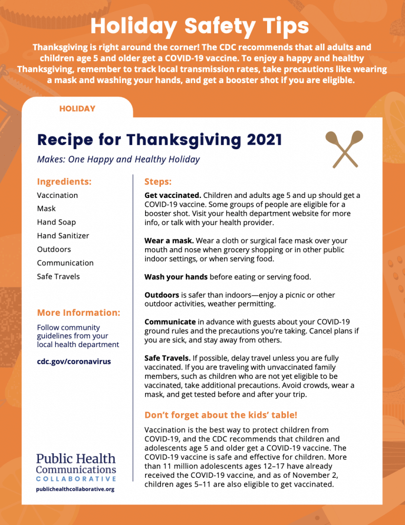 But many people are planning to gather around the table and enjoy a meal with friends and family. If that describes you, keep in mind that you can celebrate while also taking common-sense precautions.